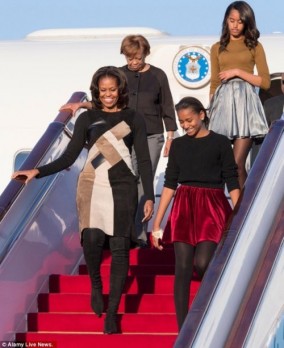 First lady Michelle Obama, her two daughters, Malia and Sasha, and her mother touched down Thursday in China for what’s being touted as a week long feel-good tourist event, amid increasing murmurs back home about U.S. taxpayers having to foot the bill.